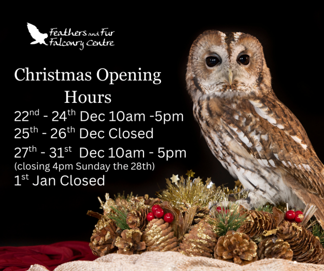 Feathers and Fur Falconry Centre Christmas Opening Hours 22nd – 24th December 10am – 5pm 25th and 26th December Closed 27th – 31st December 10am – 5pm (closing Sunday the 28th at 4PM) 1st January 2026 closed Normal Hours onwards.